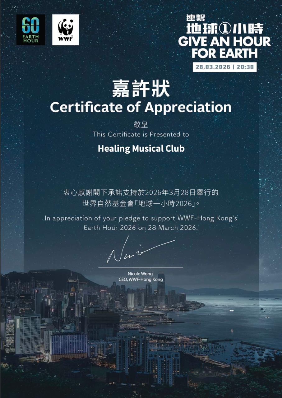 Healing Musical Club ( Charity Group ) 承諾支持「地球一小時2026」。 從今天開始,Healing Musical Club ( Charity Group ) 承諾鼓勵本會會員、夥伴機構 及 客戶 在熄燈一小時後繼續改變,重新思考與大自然的聯繫,關注生態危機,實踐綠色生活態度。我們將持之以恆,以實際行動守護我們的地球家園!